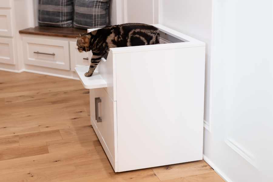 With LoftyLoo, cats have open, easy 360-degree access around the litter box cabinet furniture, and litter naturally falls into the recessed cabinet — not onto your floor.