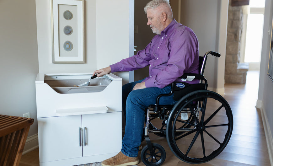 Traditional litter boxes sit on the ground, forcing painful bending, kneeling, and squatting — motions that are difficult or impossible for seniors, people with arthritis, back injuries, or limited mobility.